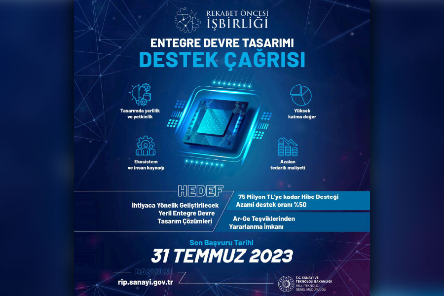 Sanayi ve Teknoloji Bakanlığı, yerli ve milli çip tasarımı çözümlerinin geliştirilmesi amacıyla Entegre Devre Tasarımı Çağrısına çıktı. Çağrı kapsamında ortaya çıkacak ürünü kullanacak en az bir kullanıcı ile çip tasarımı gerçekleştiren en az bir tasarımcı firma bir araya gelecek. Bu iş birliği sonucu ortaya çıkan ürün ve ticarileşme odaklı tasarım projeleri desteklenecek. Çağrı ile öncelikli olarak elektrik- elektronik sanayi, otomasyon ve dijital dönüşüm teknolojileri ve mobilite teknolojilerine yönelik projelere destek sağlanacak. 270 milyon lira bütçeli desteğe son başvuru, 31 Temmuz olarak belirlenmiştir.