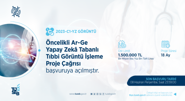 TÜSEB 2023 Yılı C Grubu Öncelikli Ar-Ge Yapay Zeka Tabanlı Tıbbi Görüntü İşleme Proje Çağrısı açılmıştır. Mevcut çağrı programı ile Türkiye’de tıbbi görüntülerden hastalık tanısı, prognozu, tedavi planlaması ve tedavisine yönelik yapay zekâ destekli çalışmaların Ar-Ge aşamasından üretim aşamasına getirilerek ürüne dönüştürülmesi ve bu alanda ülkemizin ve bulunduğu bölgenin ihtiyaçlarının karşılanması amaçlanmaktadır. Başvuru sahipleri;