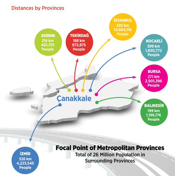 The highway distance between Çanakkale and İzmir is 326 km. Thanks to the Kınalı-Tekirdağ-Çanakkale-Balıkesir and Gebze-Orhangazi-İzmir Highway Projects, it is expected that transportation will be shortened in terms of both distance and time.
