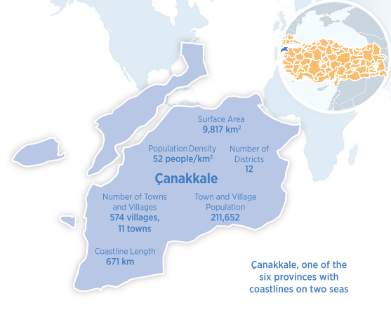 Çanakkale abuts both the Aegean and Marmara Seas, and is among the six provinces in Turkey with coastlines bordering two seas.
