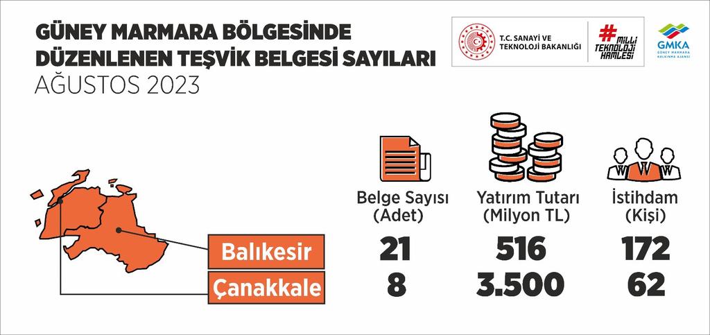 Sanayi ve Teknoloji Bakanlığı tarafından düzenlenen 2023 Ağustos ayı teşvik belgeleri Resmi Gazete'de yayımlandı.Buna göre Çanakkale'de 8 adet teşvik belgesi düzenlenmiştir. Bu teşvik belgeleriyle toplamda 3.500 milyon sabit sermaye yatırımı gerçekleştrilecek ve 62 yeni istihdam olacaktır.