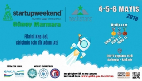 Girişimciliğe ilk adım için tüm dünyada takip edilen ve pek çok startup’ın tohumlarının atıldığı Girişimcilik Yarışması Startup Weekend 4-5-6 Mayıs tarihlerinde, Güney Marmara Kalkınma Ajansı (GMKA) desteğiyle, Burhaniye'de BUBYO Uygulama Oteli'nde gerçekleşecek.